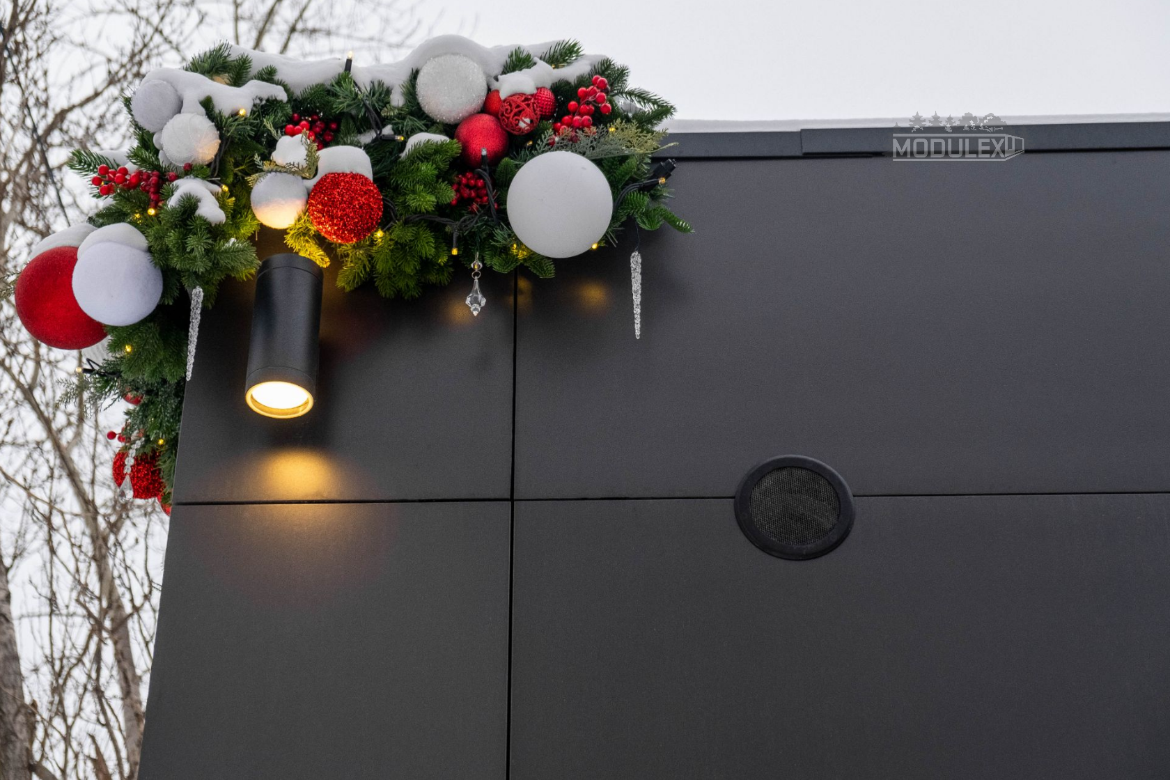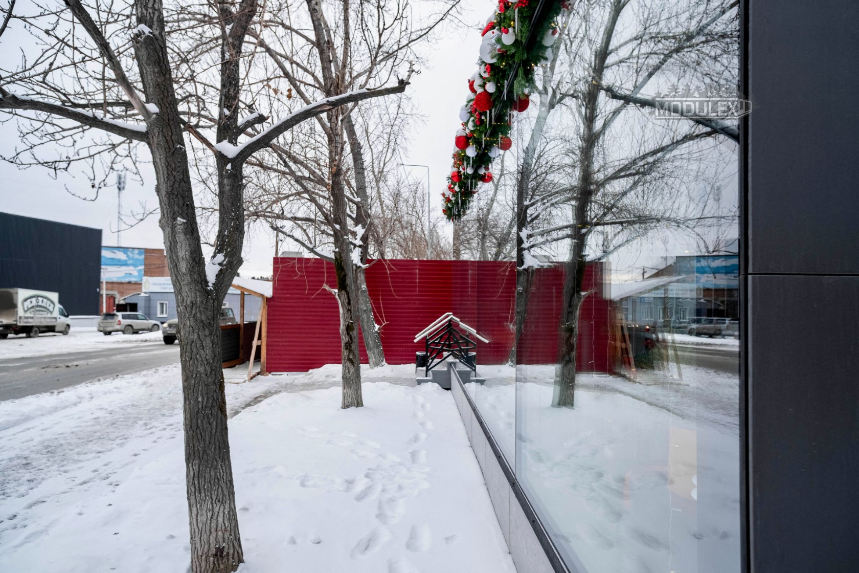 Прочный LVL-каркас: выдерживает нагрузку от стеклянной стены длиной 8,5 м и 2 тонн керамогранита. Общий вес модуля — 9,6 тонн.