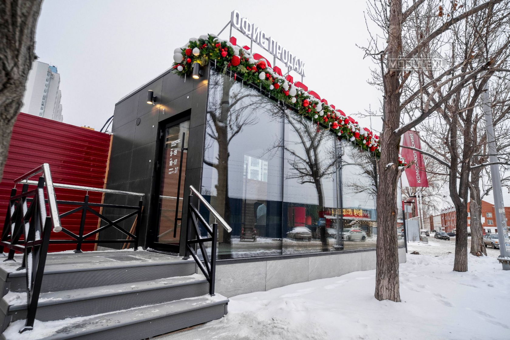 Премиальная отделка: Фасад из керамогранита и панорамное безрамное остекление создают эффект стационарного здания.